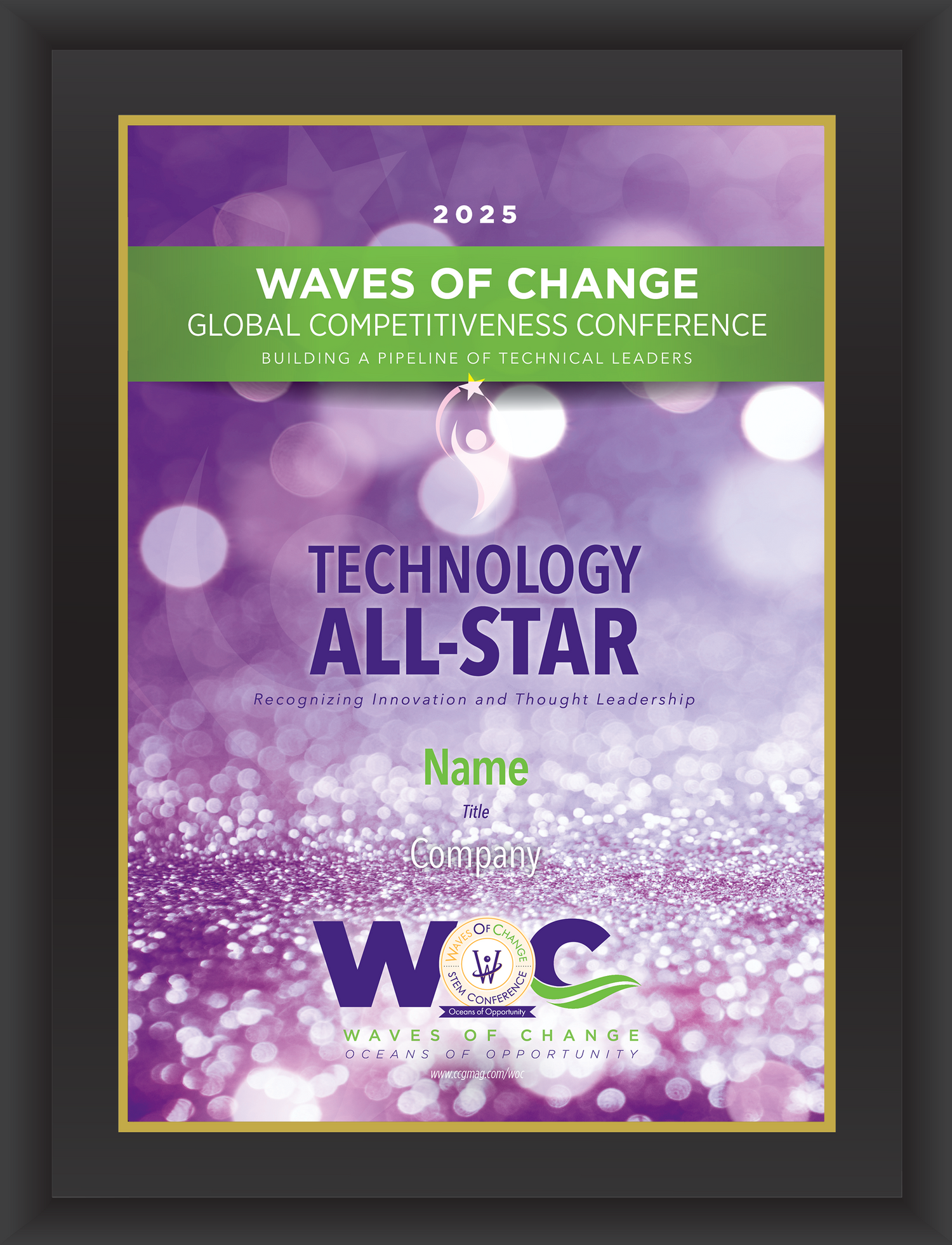 Technology All-Star Award Description: Technology All-Stars are accomplished employees from mid-level to advanced stages of their career (with 22 years or more in the workforce) that have demonstrated excellence in the workplace and in their communities. They are honored at a special recognition event during the Waves of Change STEM Global Competitiveness Conference.